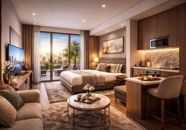 Studio/1-bed serviced residences ideal for professionals, investors, or aspirational buyers looking for compact luxury homes.